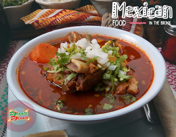 Homini soup with chicken topped with pico de gallo and avocado. Served with tostada.