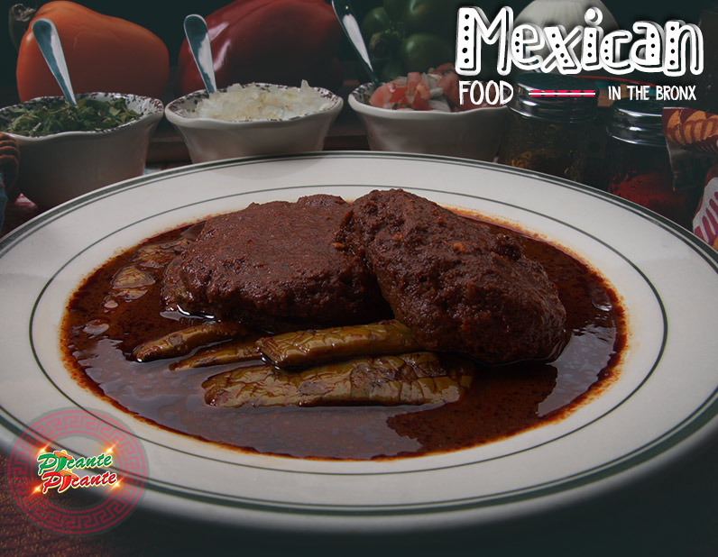 Shrimp patties with cactus in mole sauce. Served with rice, beans and tortillas or your choice of side order